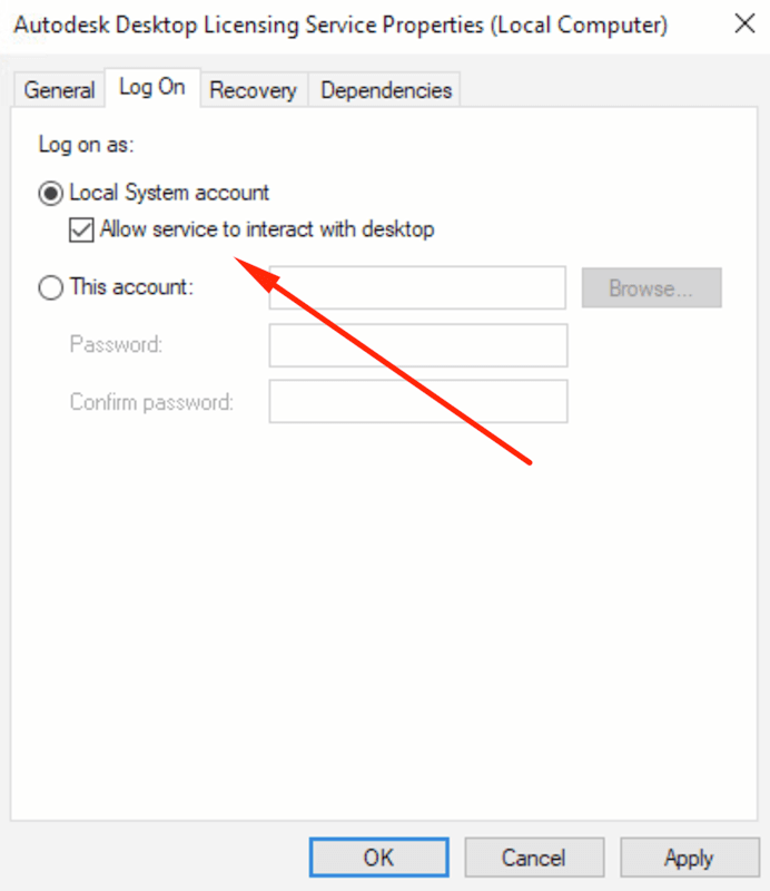 - Paso 3. Pulse la pestaña «Inicio de sesión» para marcar «Cuenta del sistema local» y seleccione «Permitir que el servicio interactúe con el escritorio».