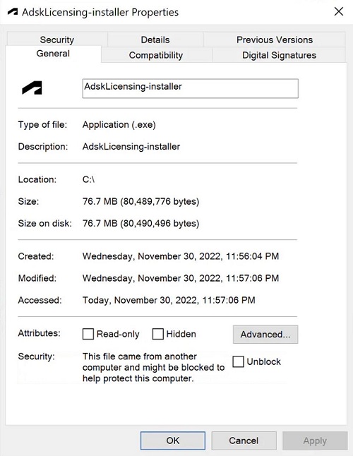 - Paso 3. Haga clic con el botón derecho del ratón en el archivo «AdskLicensing-installer.exe» y vaya a Propiedades > Pestaña General. Si aparece una ventana de seguridad como la que se muestra a continuación, seleccione «Desbloquear».