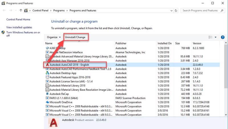 - Paso 8. Vuelve a abrir el Panel de control para desinstalar Autodesk Genuine Service. Después, puedes visitar el sitio web oficial de Autodesk para reinstalar la última versión de AutoCAD.