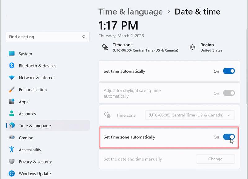- Paso 3. Active los dos interruptores «Ajustar hora automáticamente» y «Ajustar zona horaria automáticamente» para que su zona horaria coincida con la hora de Internet.