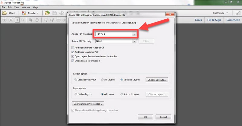 PASO 2. En el diálogo, elija «Adobe PDF Standard» como «PDF/E-1».