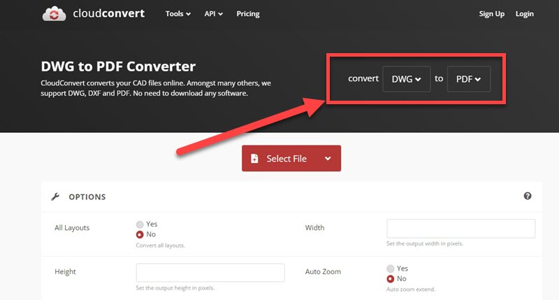 Si no le gusta instalar ningún software debido a la seguridad del sistema, puedes considerar la posibilidad de utilizar un conversor gratuito de DWG a PDF en línea como ayuda. Cloudconvert ofrece una herramienta de este tipo que también te permite decidir el número de páginas, crear PDF/A-1, incluir marcas o cifrar el archivo PDF. Puede consultar cómo convertir DWG a PDF online aquí.