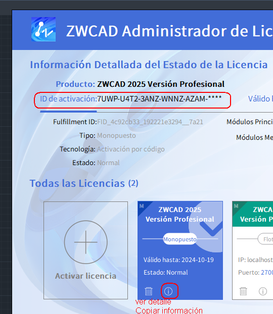 Dentro del administrador de licencia, en la parte superior se puede ver el código de activación. Los últimos caracteres aparecen ocultos por seguridad. En la parte inferior aparece una tarjeta con la información de la licencia. Haciendo clic en el botón ( i ) se muestra la información y puede copiarse