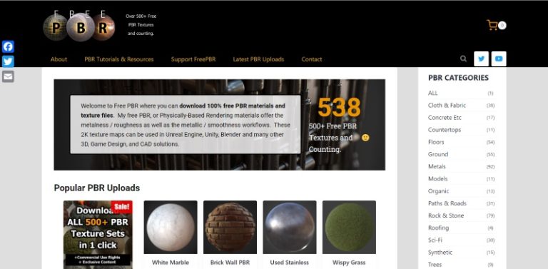 La interfaz de usuario de FreePBR presenta un diseño limpio y sencillo, que permite a los usuarios explorar y buscar fácilmente las texturas que necesitan. También ofrece cursos tutoriales gratuitos de PBR. Cada textura de FreePBR viene con una imagen de vista previa, descripciones detalladas de las texturas y enlaces de descarga. Además, FreePBR también ofrece una opción para descargar todos los conjuntos de texturas PBR a la vez por $16 si prefieres no seleccionarlos individualmente.