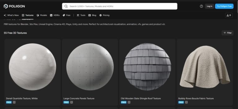 Poligon es un sitio web reconocido con recursos de texturas de alta calidad. Puedes acceder a más de 3000 texturas, modelos y HDRI en este sitio. Sin embargo, Poligon no es completamente gratuito. De todas las texturas disponibles, solo se puede acceder a 55 de forma gratuita y la mayoría de los recursos requieren una suscripción.