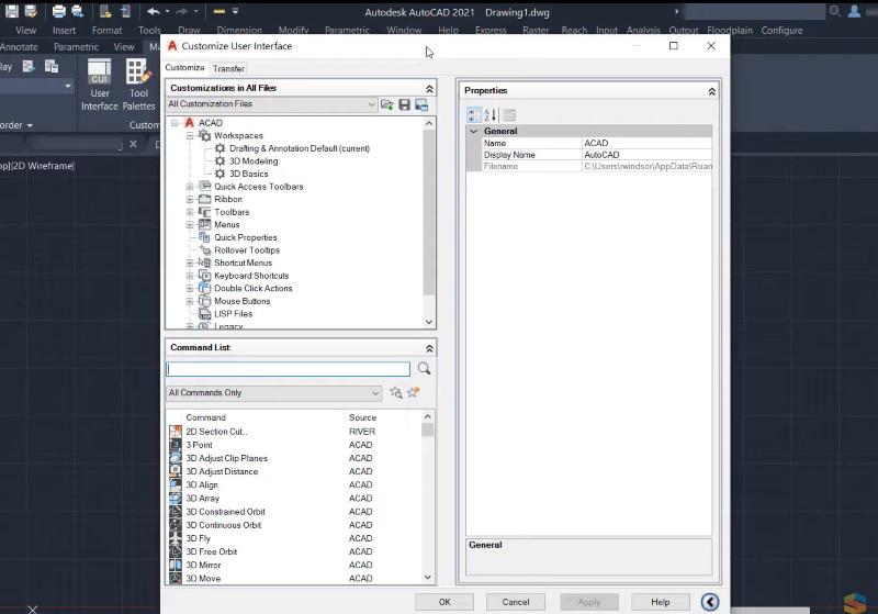 - La ventana CUI muestra una lista de los distintos elementos de la interfaz de usuario disponibles en AutoCAD, incluidos los espacios de trabajo, los menús, las barras de herramientas y las pestañas de la cinta.