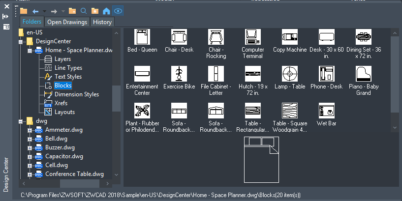 Como puede ver en la imagen a continuación, hay tres partes en la ventana del Centro de Diseño. A la izquierda, la navegación en árbol contiene una lista de archivos o carpetas, mientras que puede encontrar todo el contenido, como bloques y capas a la derecha. Y estas dos áreas están controladas por la barra de herramientas en la parte superior.