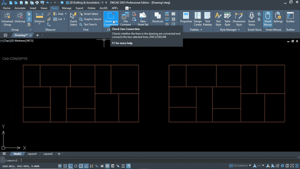 Garantice la integridad de sus diseños con la función «Comprobar conexión de líneas». Esta herramienta identifica rápidamente los huecos que a menudo son invisibles a simple vista en dibujos complejos, permitiéndole encontrar y cerrar rápidamente los huecos entre áreas. Es una función esencial para garantizar la precisión y fiabilidad de sus dibujos.